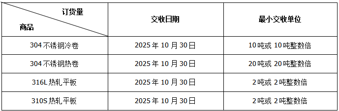 交收期为10月的304不锈钢冷卷、304不锈钢热卷,、316L热轧平板、310S热轧平板已进入交收月,按照中心《购销业务规则》及《现货购销合同》的相关规定,提示如下:
